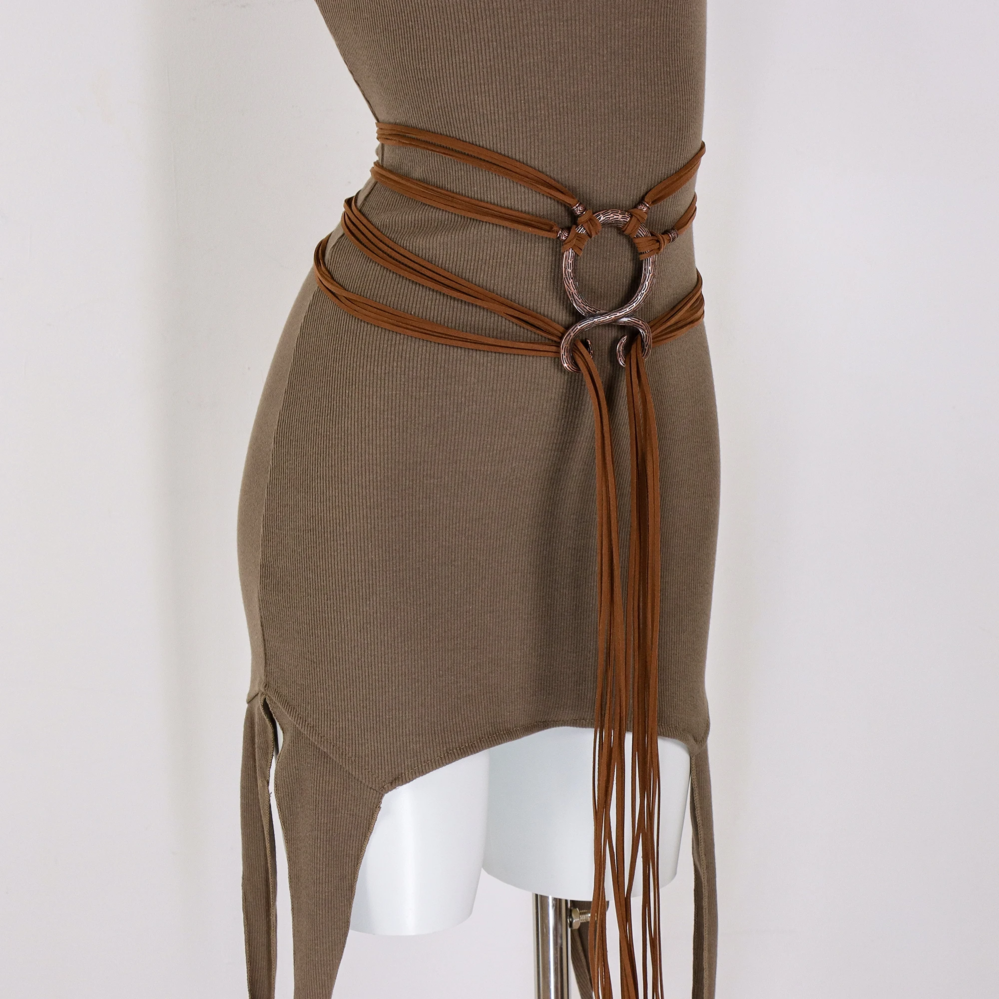 The belt that makes every outfit feel like a ritual.Extra-long vegan suede cords (200 cm) that wrap twice or three times around the waist, finished with an intricately carved bronze-tone ring and long fringing that sways with every step. Tie it high, low, loose, tight – no rules, just pure gypsy magic.Choose your element: